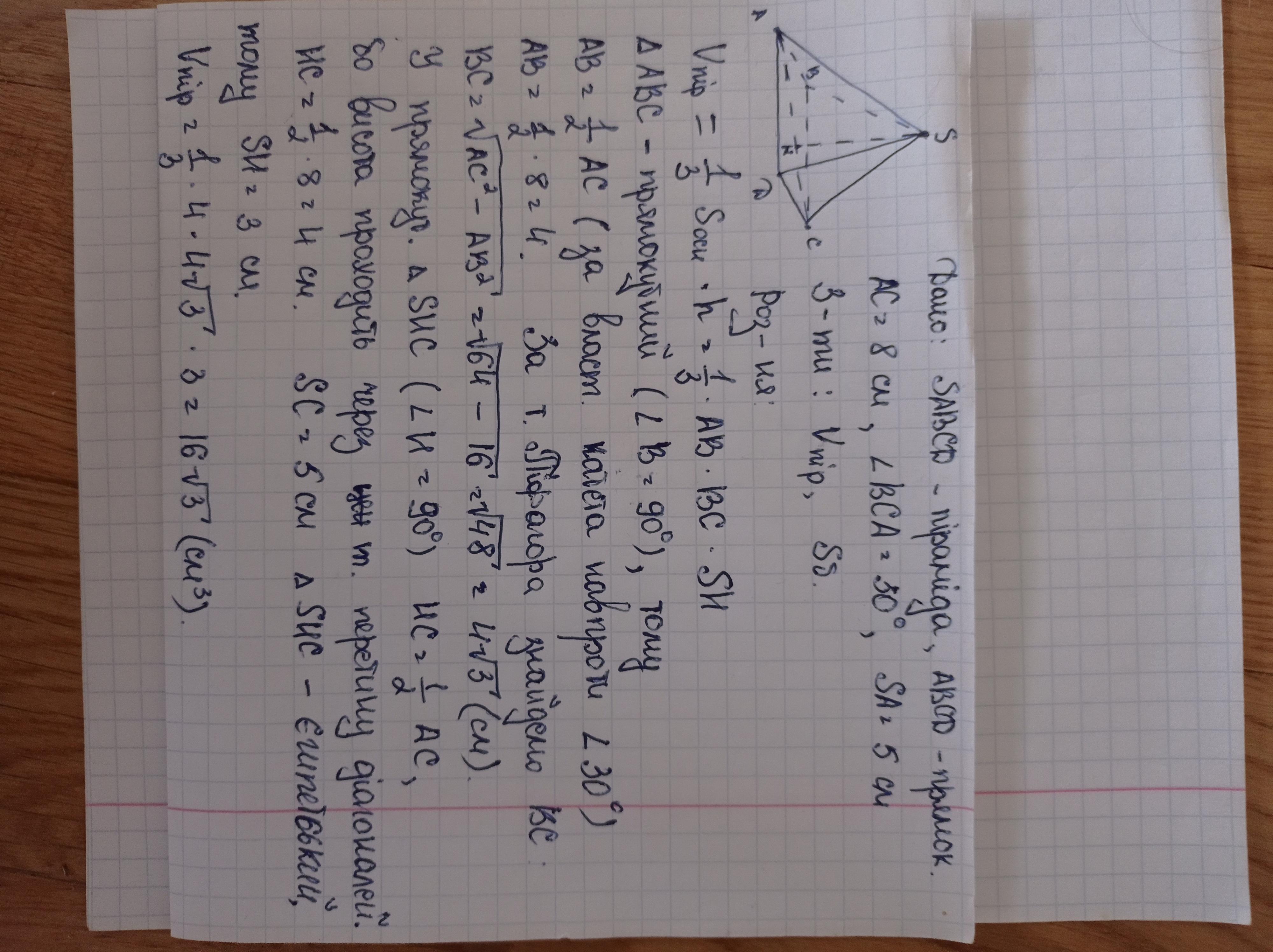 В основі піраміди лежить прямокутник, діагональ якого 8 см та утворює кут 30° з більшою стороною. Знайти Vnip та Sб, якщо бічне ребро піраміди дорівнює 5см.
