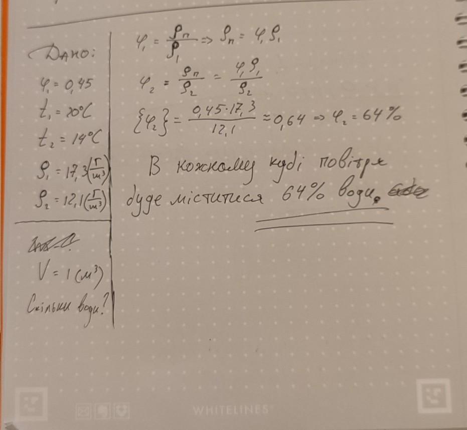 Відносна вологість становить 45 відсотків при температурі 20 градусів цельсія. Скільки води міститься в кожному кубі повітря якщо знизити температуру до 14 градусів.