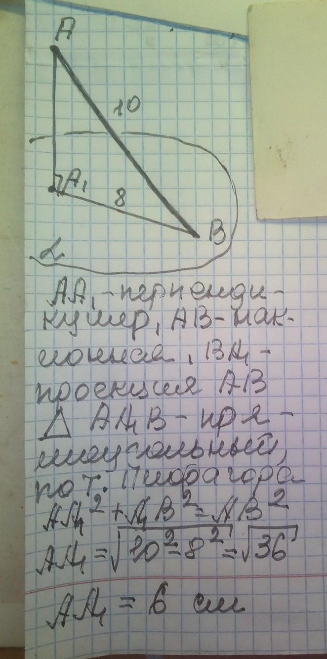 Из точки А к плоскости альфа проведены перпендикуляр АА1 и наклонная АВ. ВА1 - проекция наклонной. Найдите: AA1, если AB=10 см, BА1=8см.