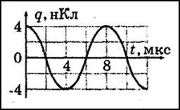 Заряженный конденсатор емкостью 40 пФ подключили к катушке индуктивности. На рисунке показан график зависимости заряда конденсатора от времени. Определите индуктивность катушки и амплитудное значение силы тока.