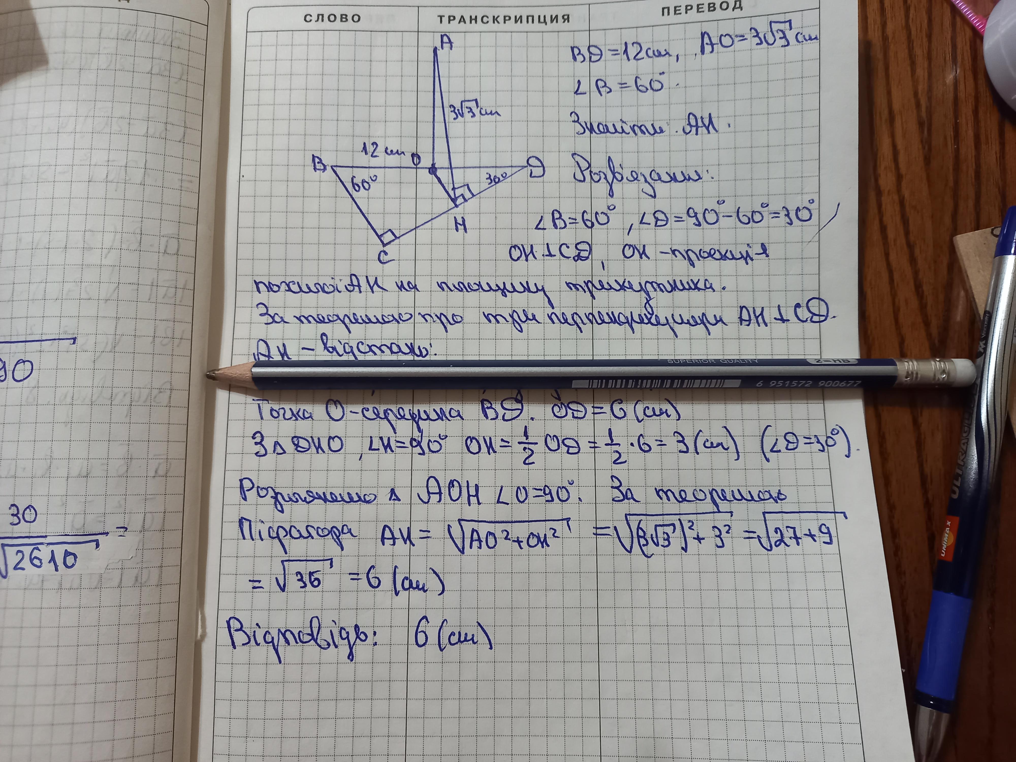 У прямокутному трикутнику гіпотенуза дорівнює 12 см, а гострий кут трикутника – 60°. Через середину гіпотенузи проведено перпендикуляр до площини трикутника довжиною 3 √3 см. Знайти відстань від верхнього кінця перпендикуляра до більшого катета.