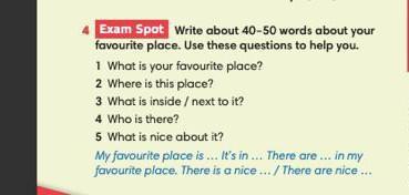 My favourite place is my home. It's in a big building near the great park. Next to it there is a modern sport ground and in 10 minutes of walking there is a cinema, which I visit quite often. My favourite place is very nice because of my family and because there I have my own room.