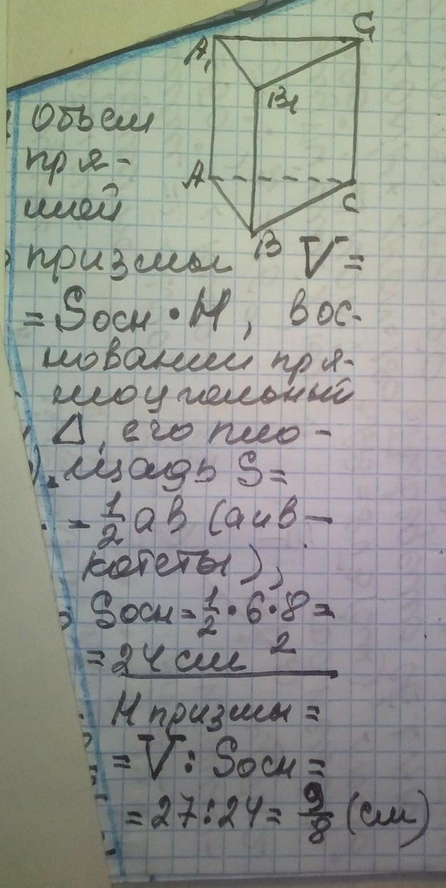 Объём прямой треугольной призмы равен 27, в основании прямоугольные треугольники с катетами 6 и 8. Найти высоту призмы.