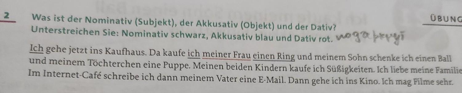 ÜBUNGEN stust not 2 Was ist der Nominativ (Subjekt), der Akkusativ (Objekt) und der Dativ? Unterstreichen Sie: Nominativ schwarz, Akkusativ blau und Dativ rot. woga pangi Ich gehe jetzt ins Kaufhaus. Da kaufe ich meiner Frau einen Ring und meinem Sohn schenke ich einen Ball und meinem Töchterchen eine Puppe. Meinen beiden Kindern kaufe ich Süßigkeiten. Ich liebe meine Familie. Im Internet-Café schreibe ich dann meinem Vater eine E-Mail. Dann gehe ich ins Kino. Ich mag Filme sehr.