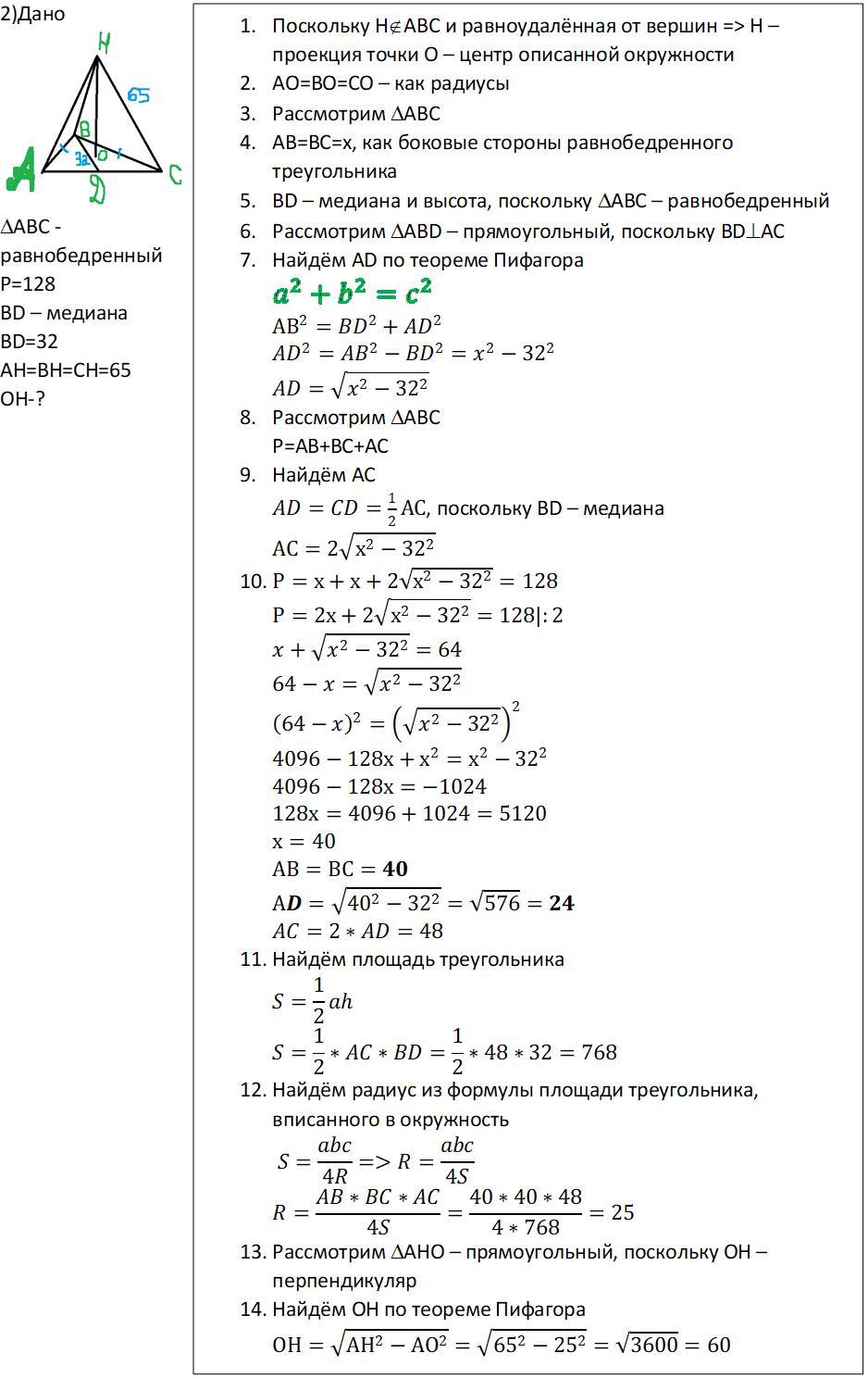 2. Периметр рівнобедреного трикутника дорівнює 128 см, а медіана,проведена до основи, дорівнює 32 см. Відстані від точки простору до вершин