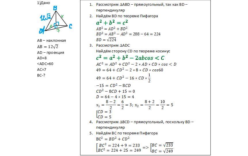 1.Із точки до площини проведемо дві похилі до неї.Довжина однієї із них дорівнює 12√2 см,а довжина її проекції 8 см. Кут між проекціями похилих дорівнює 60°,а довжина відрізка,що сполучає основи похилих, дорівнює 7 см. Знайдіть довжину другої похилої.