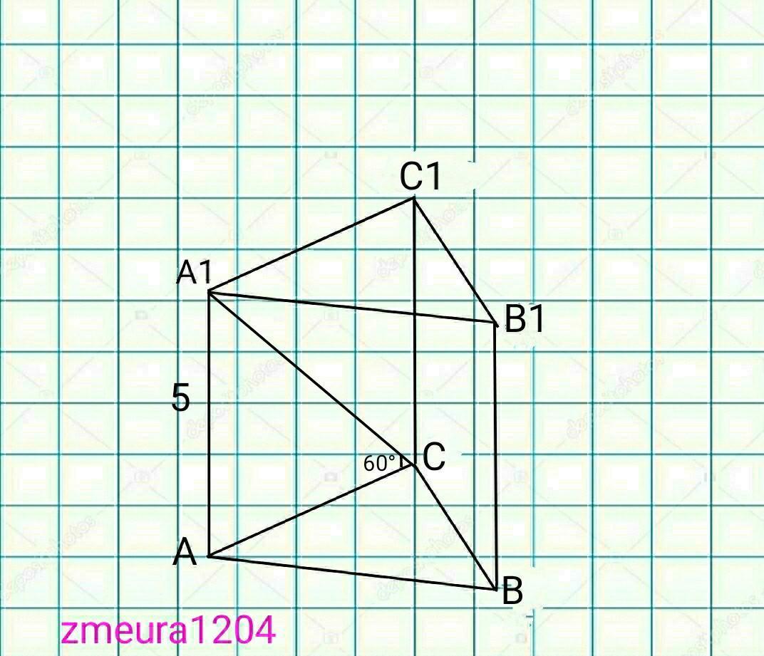 Висота правильної трикутної призми 5см , а діагональ бічної грані утворює з площиною основи кут 60. знайдіть обєм призми