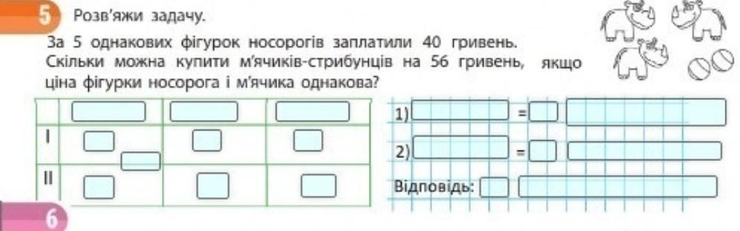 1 носорог стоит 40/5=8грн=стоимость 1 мячика. На 56 грн можно купить 56/8=7шт мячиков. Можно решить пропорцией 5/40=м/56. м=5*56/40= 7.