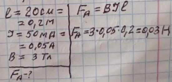 Знайти силу , що рухає провідник довжиною 20 см зі струмом 50 мА у
