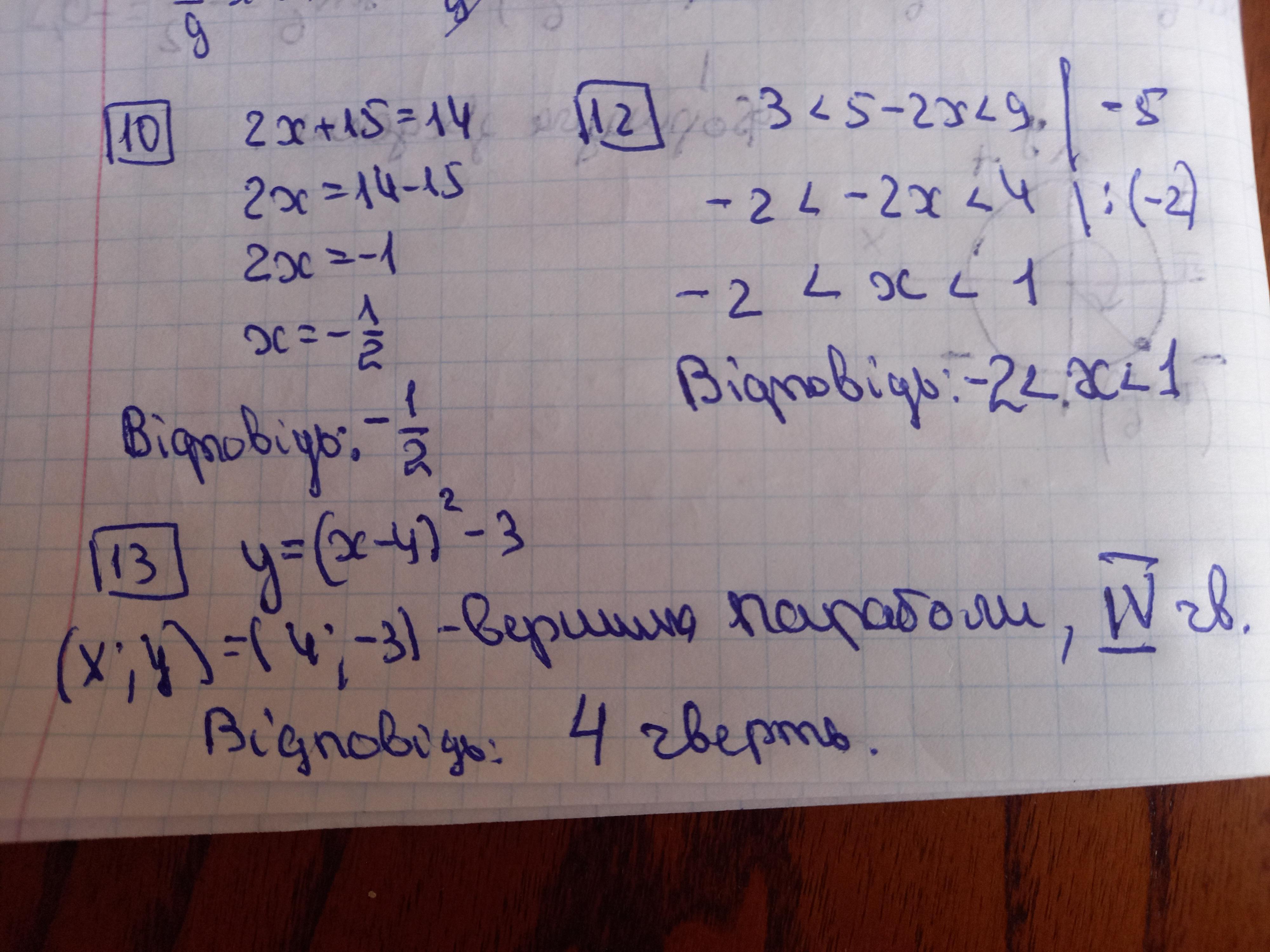 12.Розв‘яжіть подвійну нерівність 3<5-2х<9.
