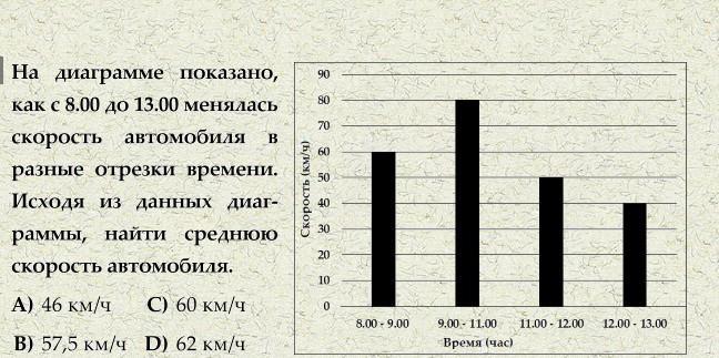 На диаграмме показано, как с 8.00 до 13.00 менялась скорость автомобиля в разные отрезки времени. Исходя из данных диаг-раммы, найти среднюю скорость автомобиля.