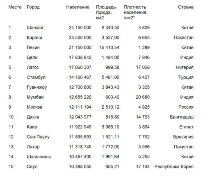 1) Если в таблице Самые большие города мира выполнить сортировку по полю Плотность населения, какая строка переместится на первое место?