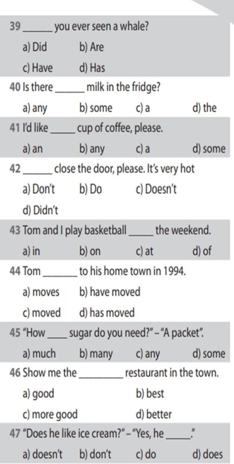 39 с) have (вопрос про жизненный опыт - видели ли вы когда-либо в своей жизни кита? В таких ситуациях используется Present Perfect)
