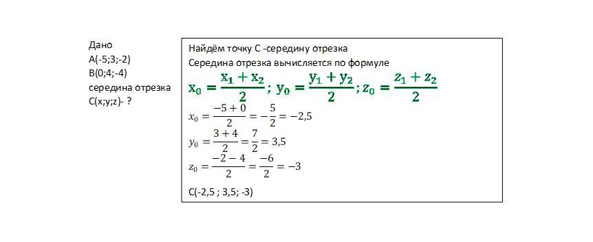 Точка С – середина отрезка АВ. Найдите координаты точки С, если точка А(-5;3;-2), а точка В(0;4;-4)