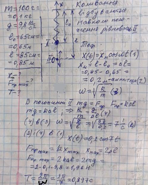 Визначити рівняння руху тягаря; амплітуду і період коливань; найбільшу силу