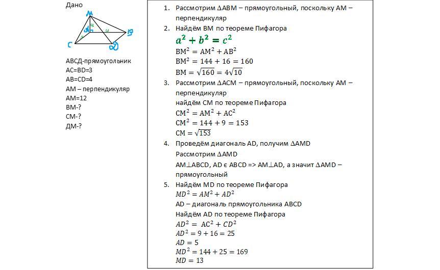 2. Із вернини А прямокутника ABCD до його площини проведений перпендикуляр AM=12 M . Знайти відстані від точки М до вершин прямокутника, якщо його сторони 3см і 4см.