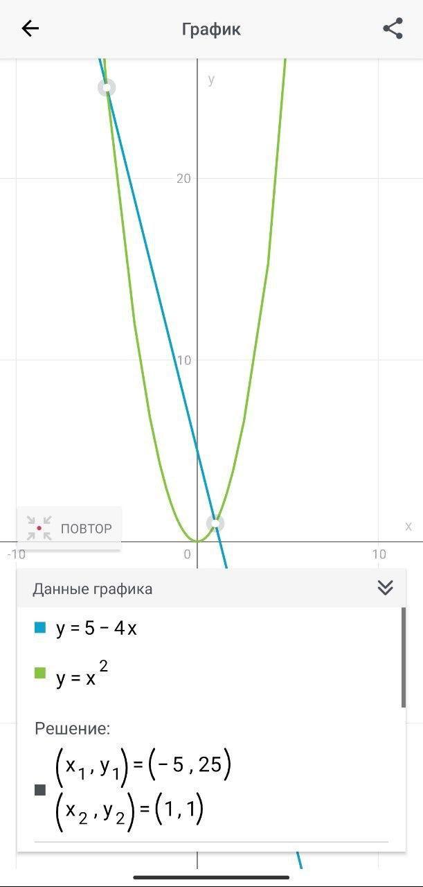 теперь рисуем их и видим что графики пересекаются на двух точках, это (-5; 25) (1; 1)