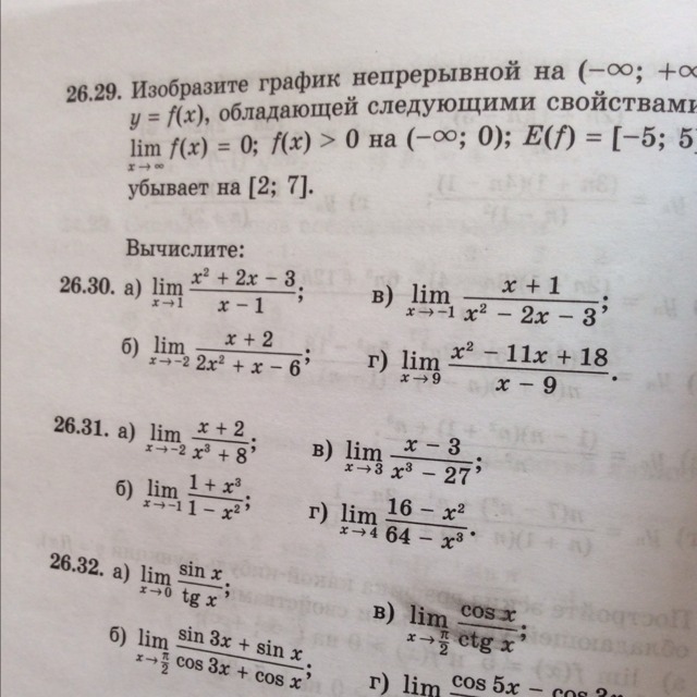 в место х подставляй значения при котором стремится предел, в п 26.30 в первом пункте вместо х в дроби подставь 1 и решай... и так со всеми примерами подставляем значения при которых х стремиться