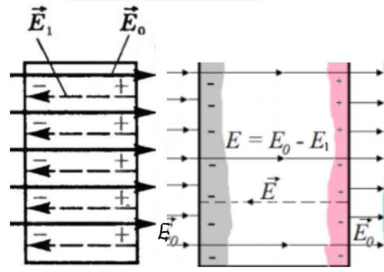Пояснення: При внесенні діелектрика до зовнішнього електричного поля в ньому виникає деякий перерозподіл зарядів, що входять до складу атомів або молекул. Зв'язані заряди створюють електричне поле яке усередині діелектрика направлене протилежно вектору напруженості зовнішнього поля. Цей процес називається поляризацією діелектрика. В результаті повне електричне поле усередині діелектрика виявляється по модулю менше зовнішнього поля