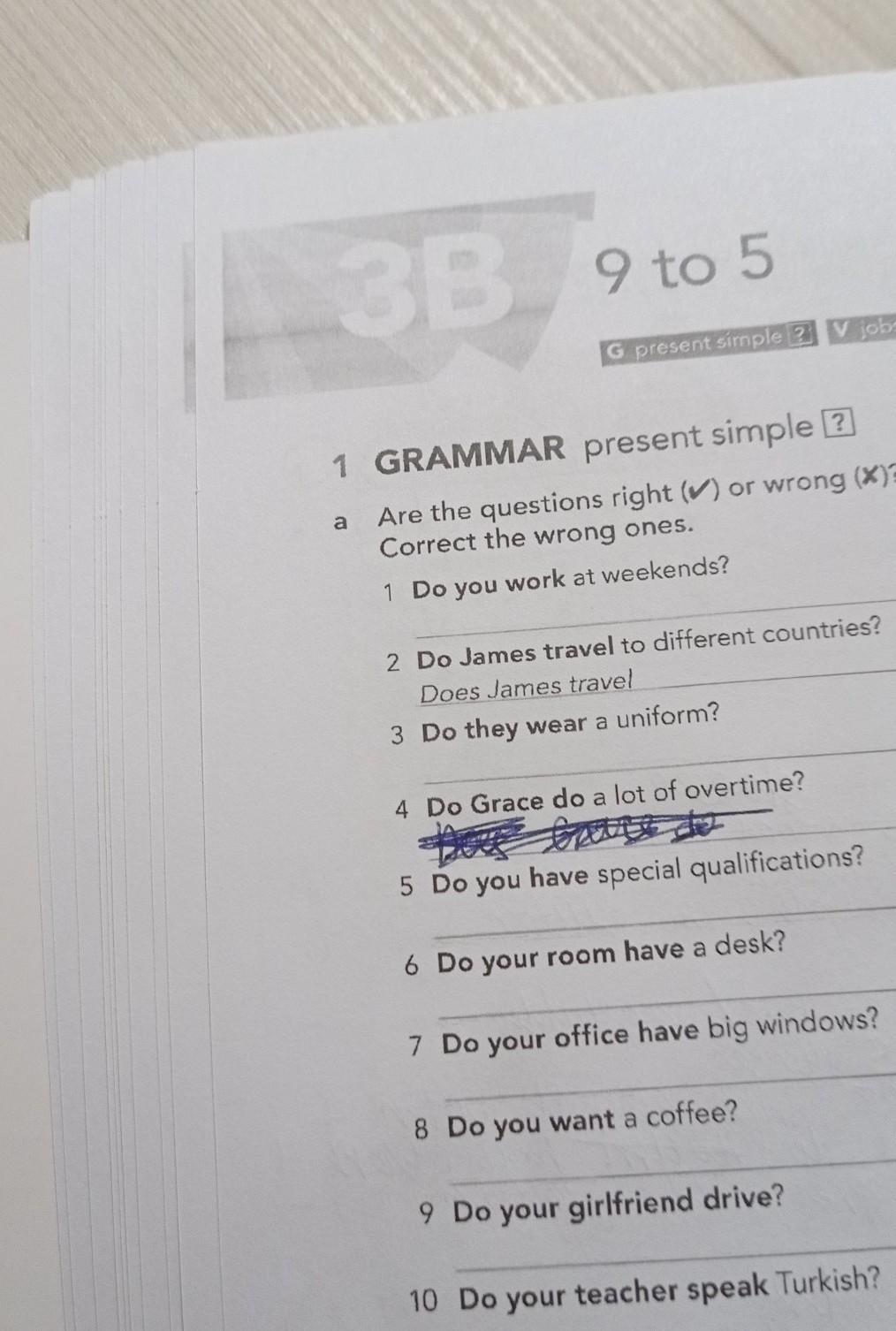 1 GRAMMAR present simple [2] Are the questions right (✔) or wrong (X)? Correct the wrong ones. 1 Do you work at weekends? 2 Do James travel to different countries? Does James travel 3 Do they wear a uniform? 4 Do Grace do a lot of overtime? 5 Do you have special qualifications? 6 Do your room have a desk? 7 Do your office have big windows? 8 Do you want a coffee? 9 Do your girlfriend drive? 10 Do your teacher speak Turkish? помогите пожалуйста
