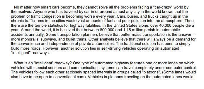 - "One expert has said that the typical highway lane today can handle 2,000 vehicles per hour but estimated that an intelligent highway lane could accommodate up to 6,000 vehicles, depending on the number of entrances and exits."