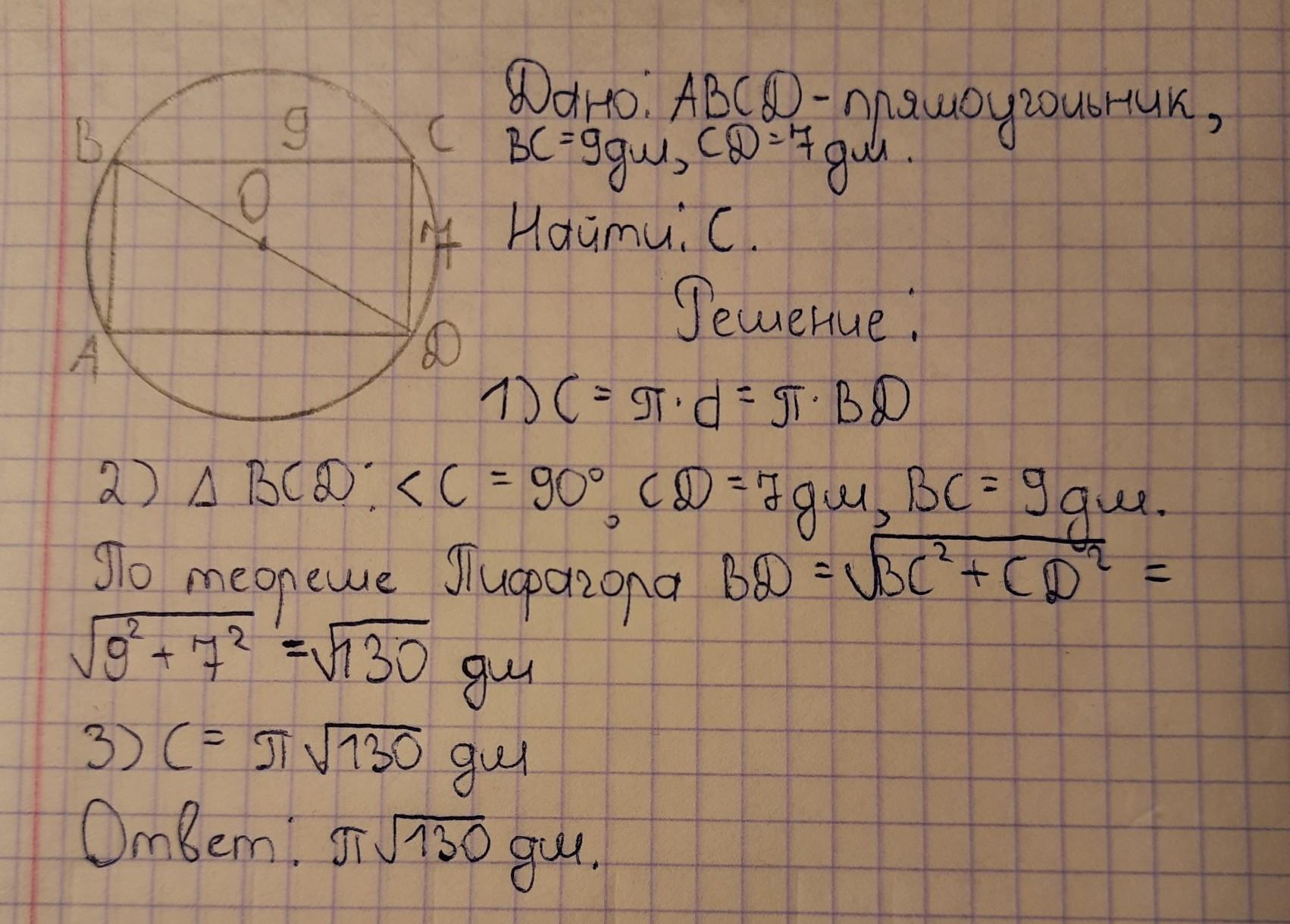 НАГРАЖУ ЛУЧШИМ ОТВЕТОМ!!!! СРОЧНО!!! ГЕОМЕТРИЯ!!!Около прямоугольника стороны которого 7 дм и 9 дм описано окружность.найдите длину этой окружности
