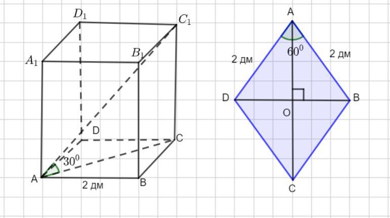 Основанием прямого параллелепипеда является ромб со стороной 2 дм и острым углом 60°. Большая диагональ параллелепипеда наклонена к плоскости основания под углом 30°. Найти площадь боковой поверхности параллелепипеда.