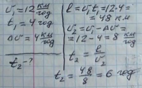 лижник планував піти зі швидкістю 12 км/год і за 4 год дістатися до наміченої цілі. Але рухався він зі швидкістю на 4 км/год меншою. за який час лижник дістався до наміченої цілі?