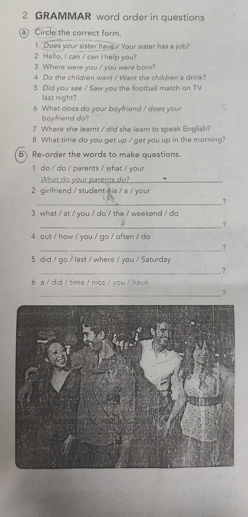 2 GRAMMAR word order in questions Circle the correct form. 1 Does your sister have Your sister has a job? 2 Hello, I can / can I help you? 3 Where were you/you were born? 4 Do the children want / Want the children a drink? 5 a Did you see / Saw you the football match on TV last night? 6 What does do your boyfriend / does your boyfriend do? 7 Where she learnt / did she learn to speak English? 8 What time do you get up / get you up in the morning? Re-order the words to make questions. 1 do / do / parents / what / your What do your parents do? 2 girlfriend / student /is/a/ your 3 what / at / you / do / the / weekend / do 4 out /how/you/go/ often / do 5 did/go/last/where/you / Saturday 6 a/did / time / nice / you/ have ? 2 GRAMMAR word order in questions Circle the correct form . 1 Does your sister have Your sister has a job ? 2 Hello , I can / can I help you ? 3 Where were you / you were born ? 4 Do the children want / Want the children a drink ? 5 a Did you see / Saw you the football match on TV last night ? 6 What does do your boyfriend / does your boyfriend do ? 7 Where she learnt / did she learn to speak English ? 8 What time do you get up / get you up in the morning ? Re - order the words to make questions . 1 do / do / parents / what / your What do your parents do ? 2 girlfriend / student / is / a / your 3 what / at / you / do / the / weekend / do 4 out / how / you / go / often / do 5 did / go / last / where / you / Saturday 6 a / did / time / nice / you / have ?
