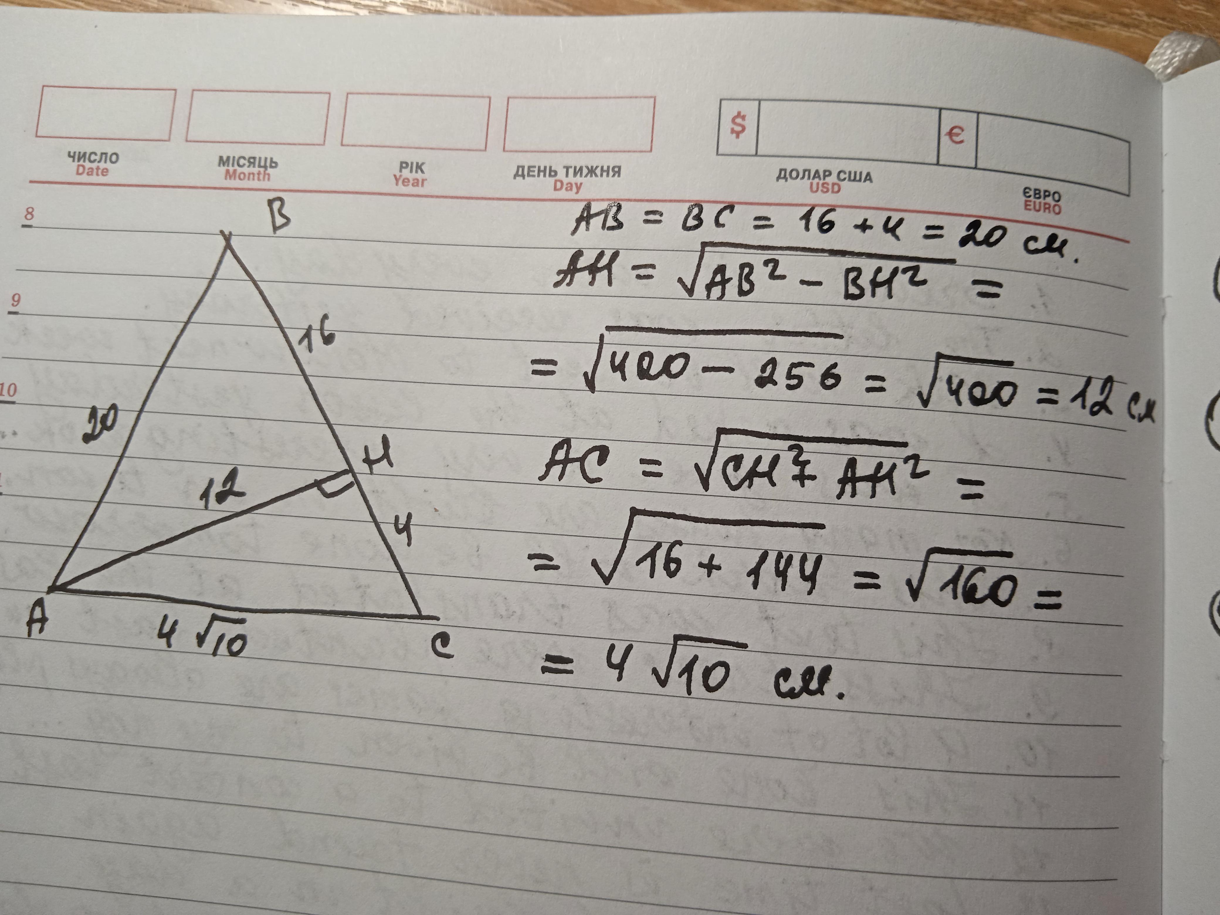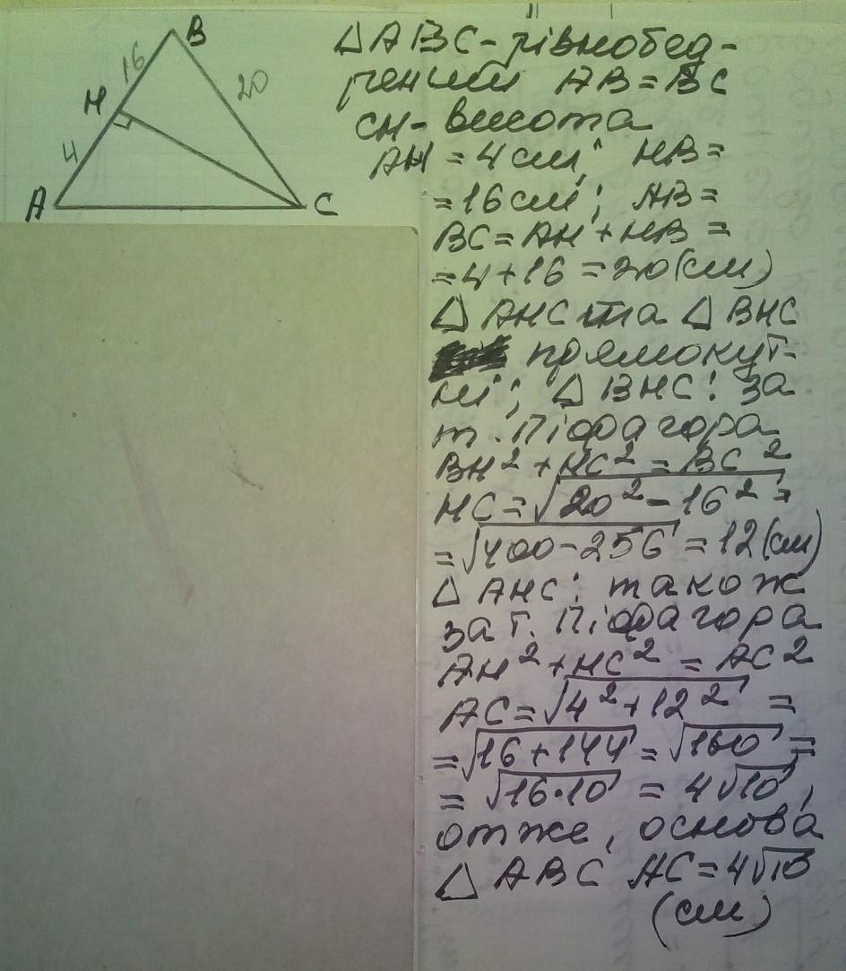 ДАЮ 30 БАЛЛОВ Висота рівнобедреного трикутника, опущена на бічну сторону, ділить її на відрізки завдовжки 4 см і 16 см, рахуючи від вершини кута при основі. Знайдіть основу рівнобедреного трикутника.