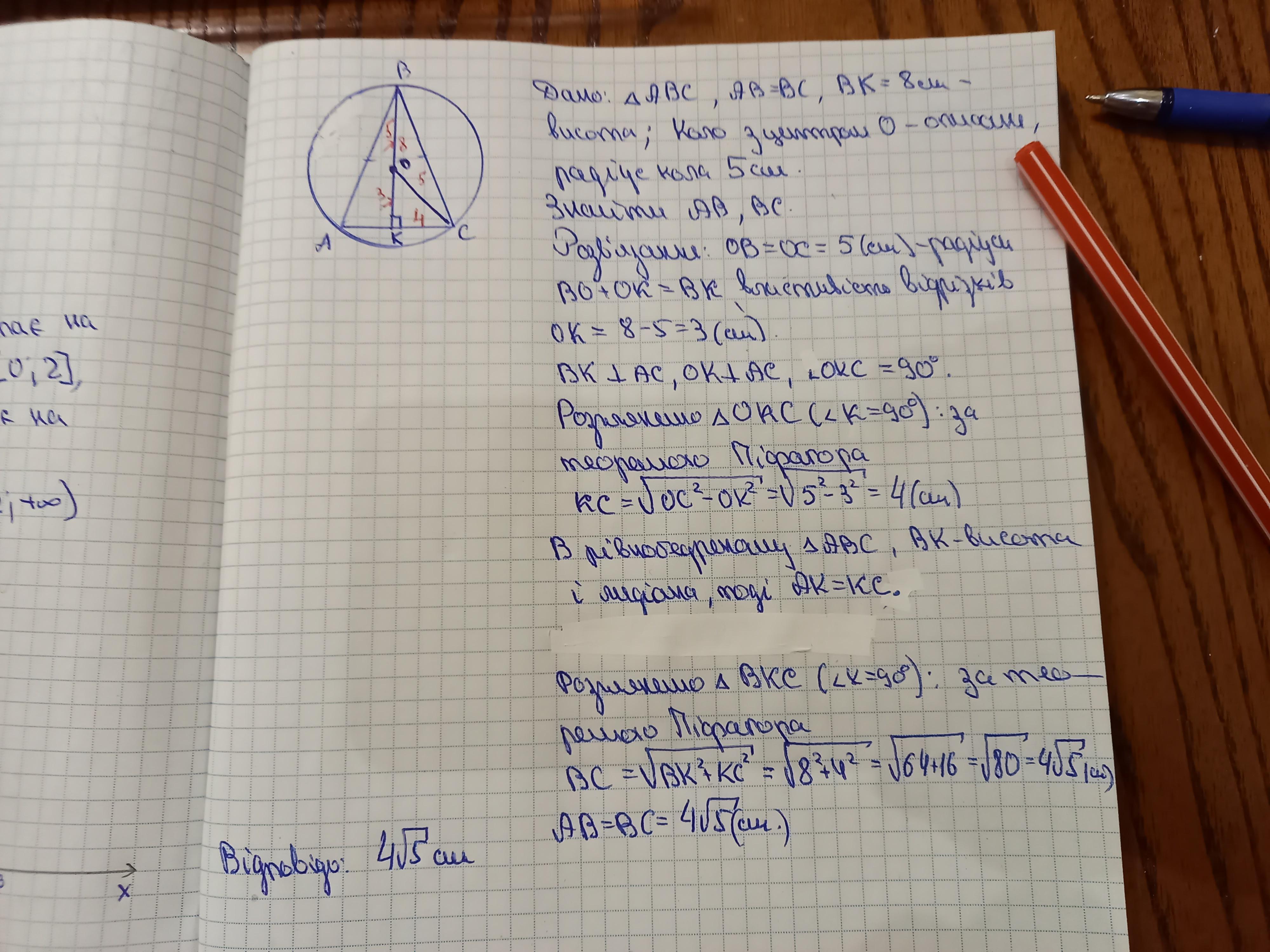 ДАЮ 30 БАЛЛОВ Висота рівнобедреного гострокутного трикутника, проведена до його основи, дорівнює 8 см, а радіус кола, описаного на- 5 см. Знайдіть бічну сторону трикутника. вколо нього, -