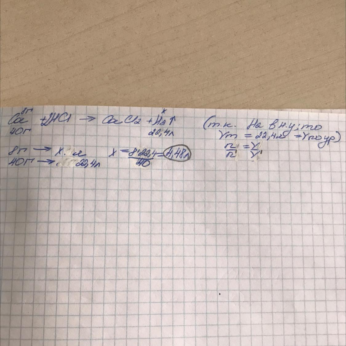 При взаимодействии кальция массой 8 г раствора соляной кислоты выделился водород (н. у.) объемом ___ л.