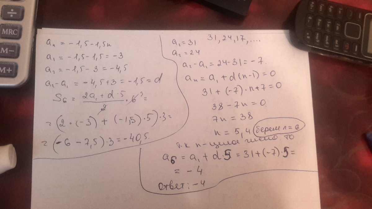 Арифметическая прогрессия (An) задана условием: An= -1,5 -1,5n. Найдите сумму первых шести членов прогрессии.