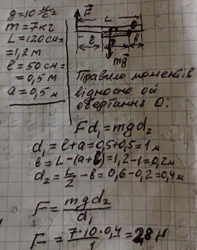 Труба масою 7 кг і довжиною 120 см лежить на табуреті шириною 0,5 м так, що зліва виступає 50 см труби. Яку силу треба прикласти, щоб підняти трубу за лівий кінець?
