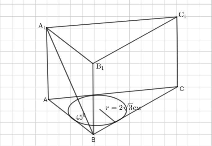 В правильной треугольной призме радиус окружности вписанной в основание, равен 2√3 см. Диагональ боковой грани образует с плоскостью основания угол 45°. Найти площадь боковой поверхности призмы.