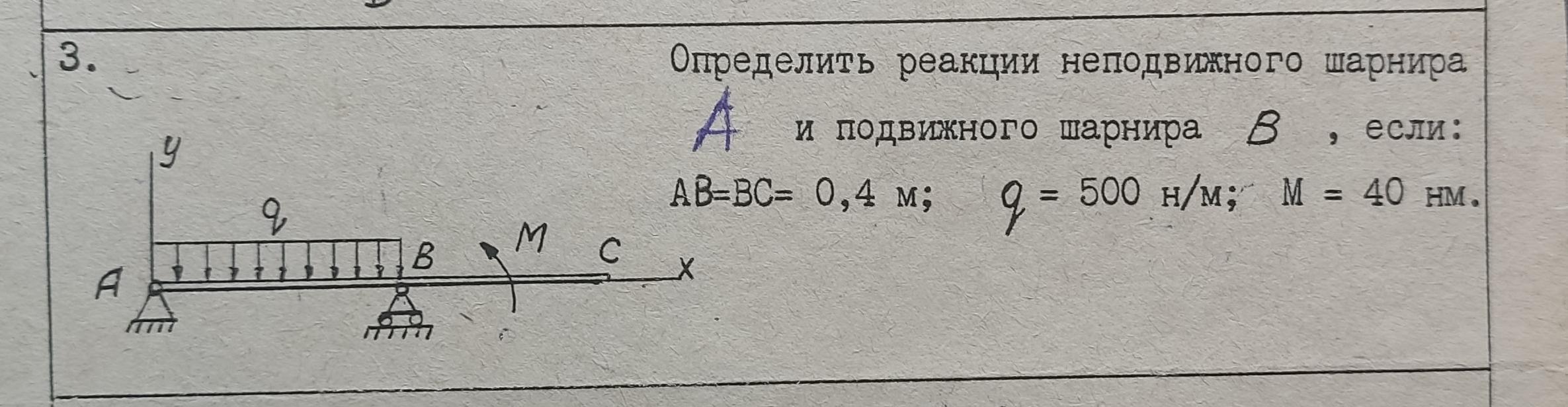 Определить реакции неподвижного шарнира A и подвижного шарнира B, если AB=BC=0.4 м, q=500 н/м, M=40 нм.