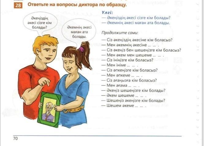 28 Ответьте на вопросы диктора по образцу. Үлгі: - Әкеңiздiң әкесi сiзге кiм болады? - Әкемнiң әкесi маған ата болады. Әкеңіздің әкесi сiзге кiм болады? UM Әкемнiң әкесi маған ата болады. Продолжиме сами: - Сiз әкеңiздiң әкесiне кiм боласыз? -Мен әкемнiң әкесiне.... - Сіз әкеңіз бен шешенiзге кім боласыз? -Мен әкем мен шешеме ... - Сiз iнiңiзге кiм боласыз? -Мен iнiме ......... - Сiз әпкеңiзге кім боласыз? -Мен әпкеме. - Сіз ағаңызға кім боласыз? -Мен ағама... - - - - -Әкеңiз шешеңiзге кiм болады? Әкем шешеме ... Шешенiз әкеңiзге кiм болады? Шешем әкеме ... 28 Ответьте на вопросы диктора по образцу . Үлгі : - Әкеңiздiң әкесi сiзге кiм болады ? - Әкемнiң әкесi маған ата болады . Әкеңіздің әкесi сiзге кiм болады ? UM Әкемнiң әкесi маған ата болады . Продолжиме сами : - Сiз әкеңiздiң әкесiне кiм боласыз ? -Мен әкемнiң әкесiне .... - Сіз әкеңіз бен шешенiзге кім боласыз ? -Мен әкем мен шешеме ... - Сiз iнiңiзге кiм боласыз ? -Мен iнiме ......... - Сiз әпкеңiзге кім боласыз ? -Мен әпкеме . - Сіз ағаңызға кім боласыз ? -Мен ағама ... - - - - -Әкеңiз шешеңiзге кiм болады ? Әкем шешеме ... Шешенiз әкеңiзге кiм болады ? Шешем әкеме ...