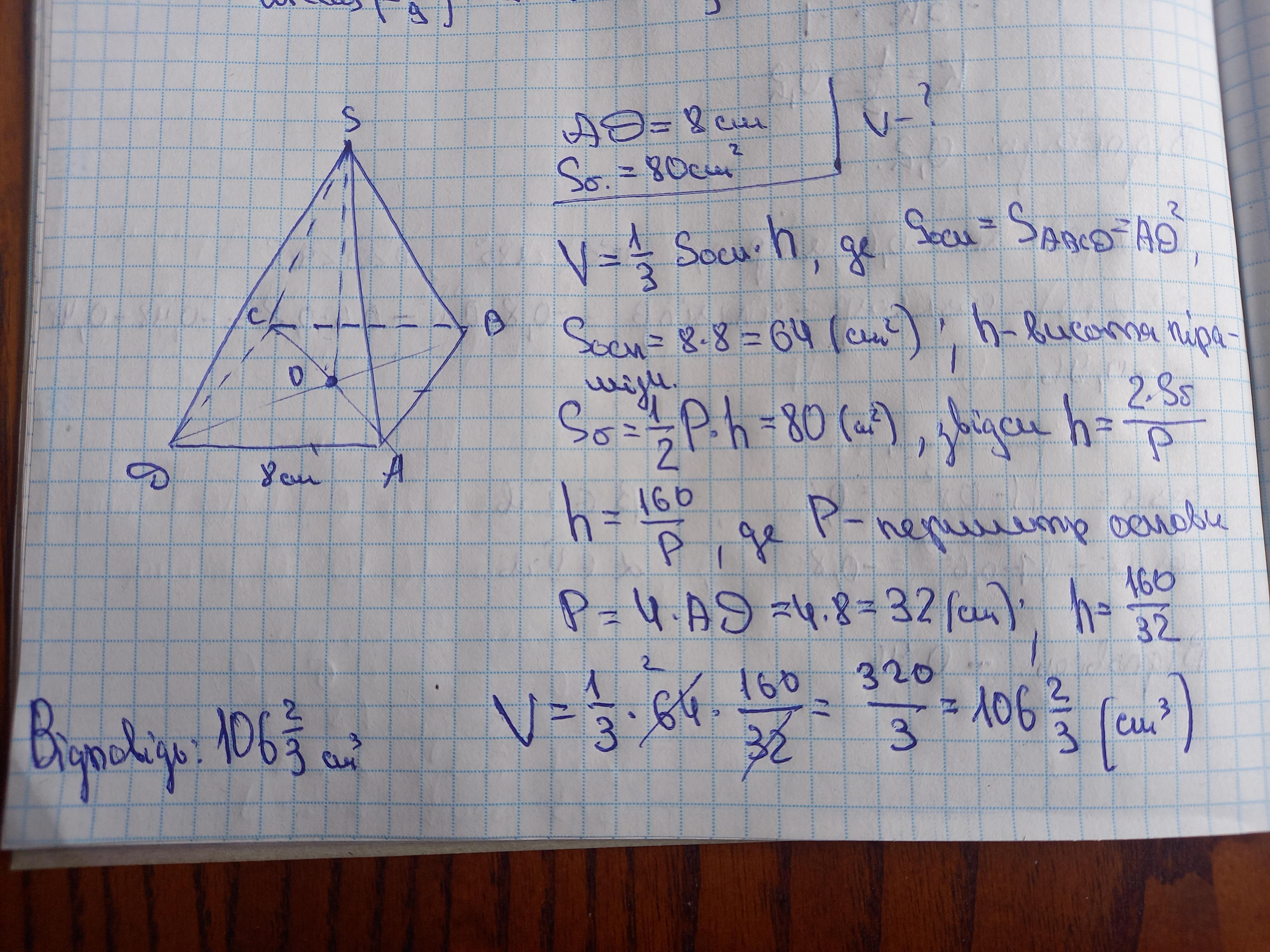 Сторона основи правильної чотирикутної піраміди дорівнює 8 см, площа бічної поверхні – 80 см2. Знайдіть об’єм піраміди.