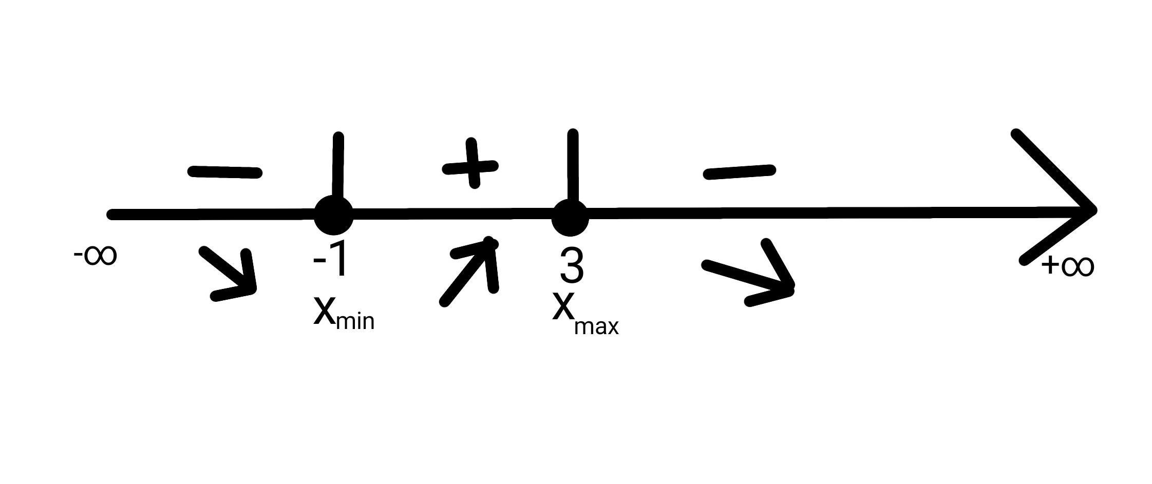 Получается наши критические точки -1 и 3 точки экстремума. До -1 функция убывала и после начала возрастать, поэтому точка -1 будет точкой минимума. До 3 функция возрастала и после начала убывать, следовательно, эта точка будет точкой максимума.