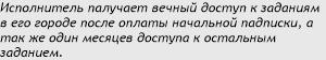 Исполнитель получает вечный доступ к заданиям в его городе после оплаты начальной подписки , а также один месяц доступа к остальным заданиям