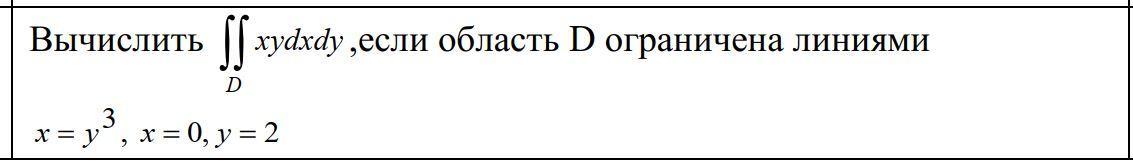Вычислить двойной интеграл xydxdy если область d ограничена линиями x = y^3, x = 0, y = 2
