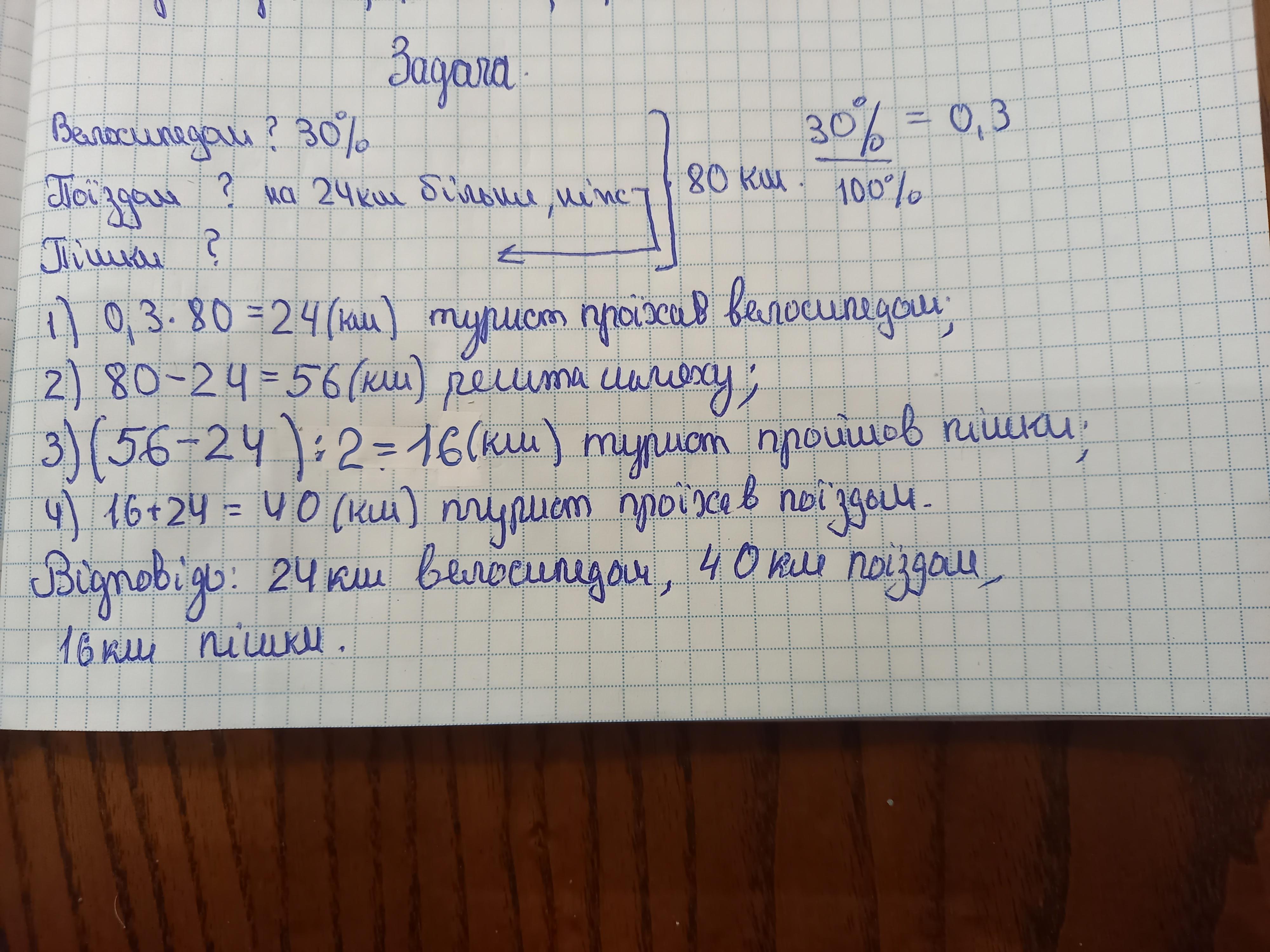турист мав подолати 80 км. 30% він проїхав велосипедом , решту добирався пішки і їхав на поїзді.Відомо що поїздом він проїхав на 24 км більше,пройшов пішки.Який шлях він проїхав велосипедом, поїздом і пішки