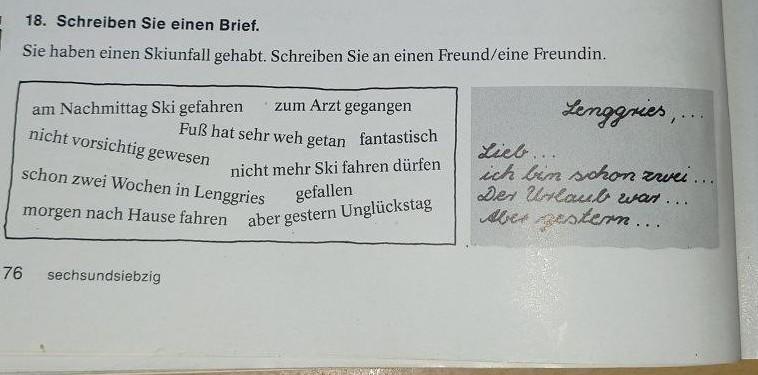 Meine Freunde und ich sind am Nachmittag Ski gefahren, das war fantastisch. Wir fahren jetzt seit zwei Wochen in Langris Ski, aber gestern hatte ich Pech, ich war nicht vorsichtig und bin gestürzt. Mein Bein tat sehr weh und ich ging zum Arzt. Der Arzt hat mir nicht mehr erlaubt, Ski zu fahren. Morgen fahre ich nach Hause, um mich zu erholen