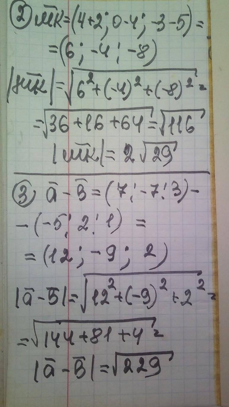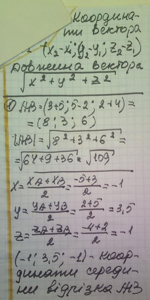 1. Дано точки А(-5; 2; -4), В(3; 5; 2). Знайдіть середину відрізка АВ, довжину відрізка АВ. 2. Дано точки М(-2; 4; 5), К(4; 0; -3). Знайдіть координати вектора і модуль вектора МК. 3. Дано a ⃗(7; -7;3),b ⃗(-5;2;1). Знайдіть координати вектора a ⃗-b ⃗; |a ⃗-b ⃗ |.