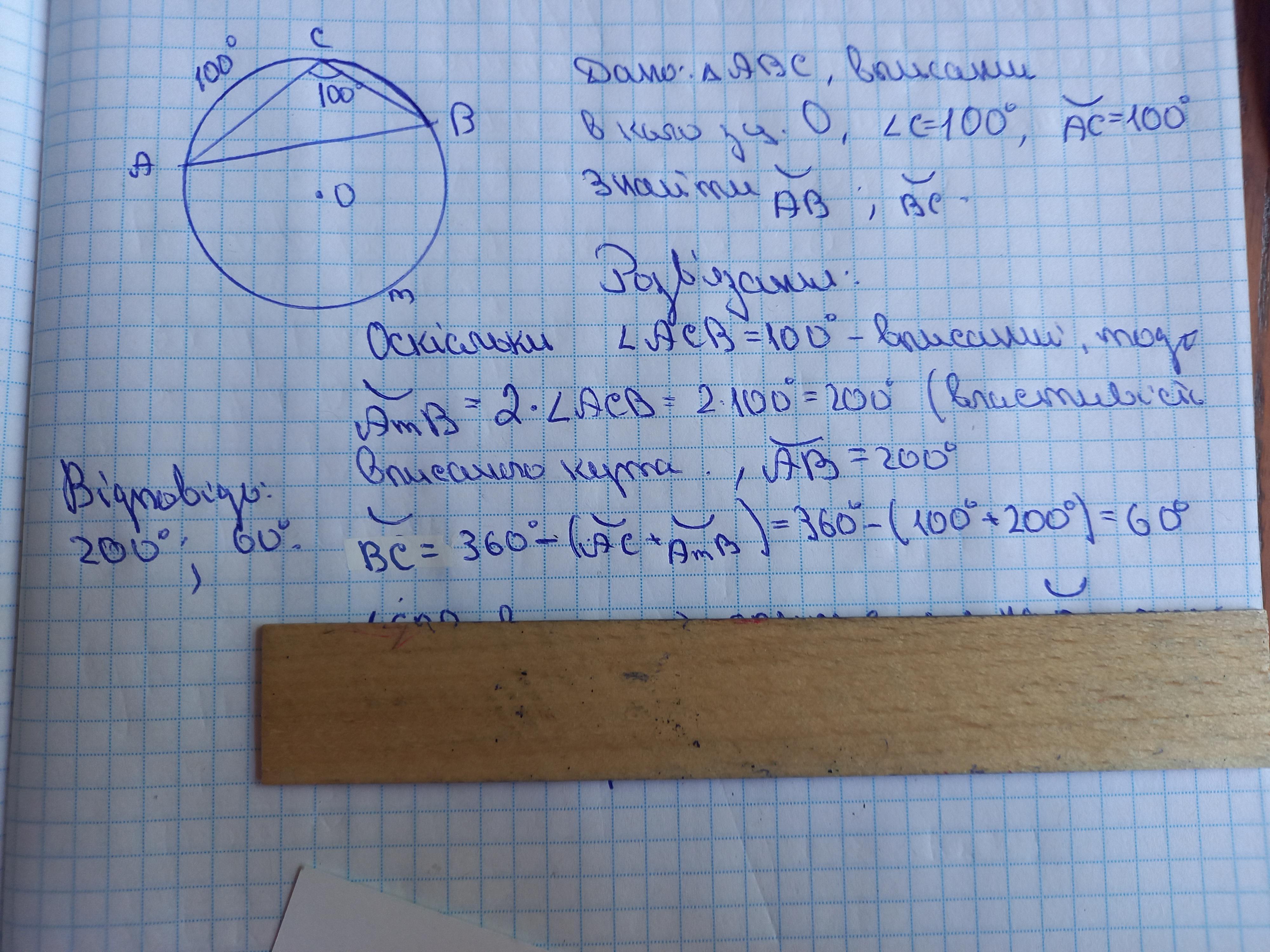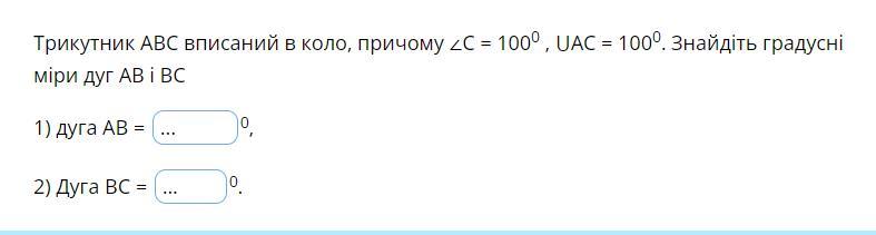 На фото вопрос, или : Трикутник АВС вписаний в коло, причому ∠С = 1000 , ⋃АС = 1000. Знайдіть градусні міри дуг АВ і ВС