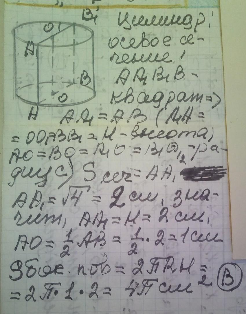 Осевое сечение цилиндра - квадрат, площадь которого 4см2. Найдите площадь боковой поверхности цилиндра.