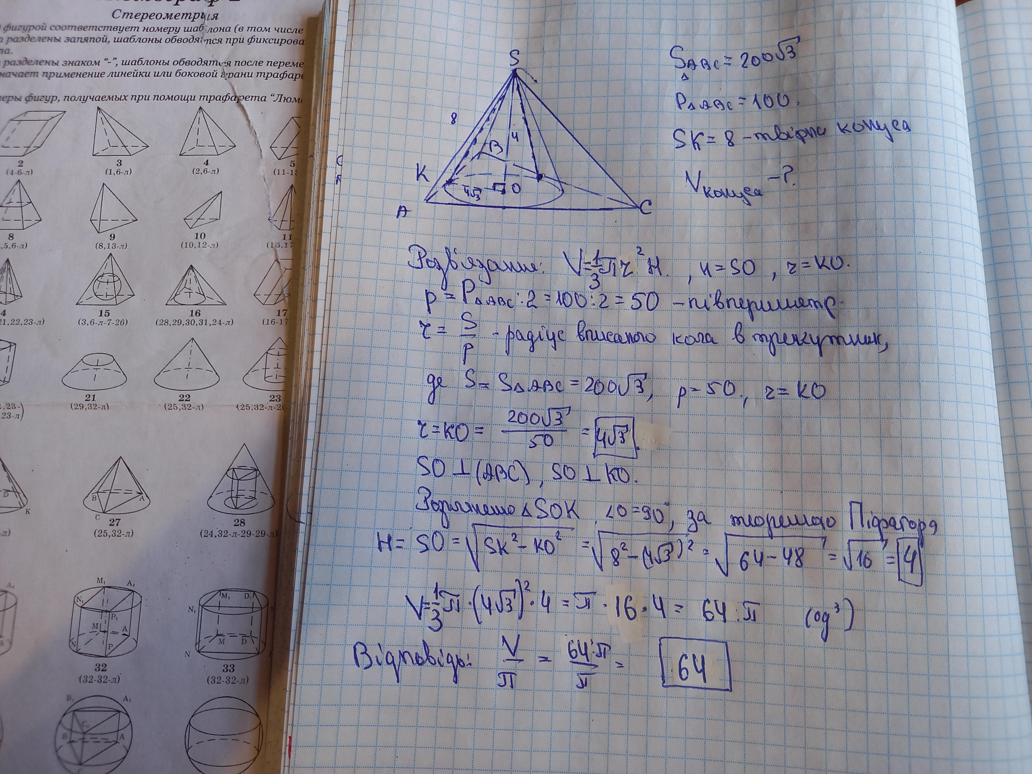 Навколо конуса описано трикутну піраміду, площа основи якої дорівнює 200√3, а периметр основи - 100. Визначте об'єм V цього конуса, якщо довжина його твірної дорівнює 8. У відповіді запишіть значення V\π. будь ласка даю 55 балов