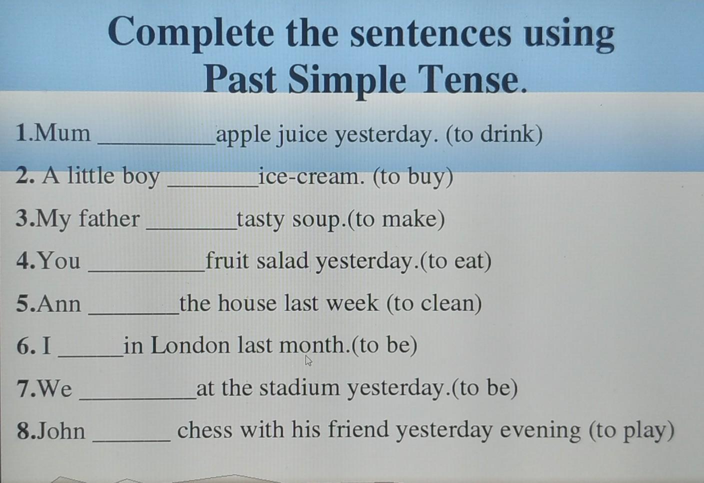 1)drank 2)bought 3)made 4)ate 5)cleaned 6)was 7)were 8)played