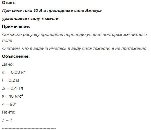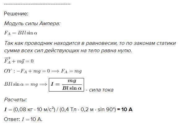 (0,08 кг · 10 м/c²) / (0,4 Тл · 0,2 м · sin 90°) = 10 A
