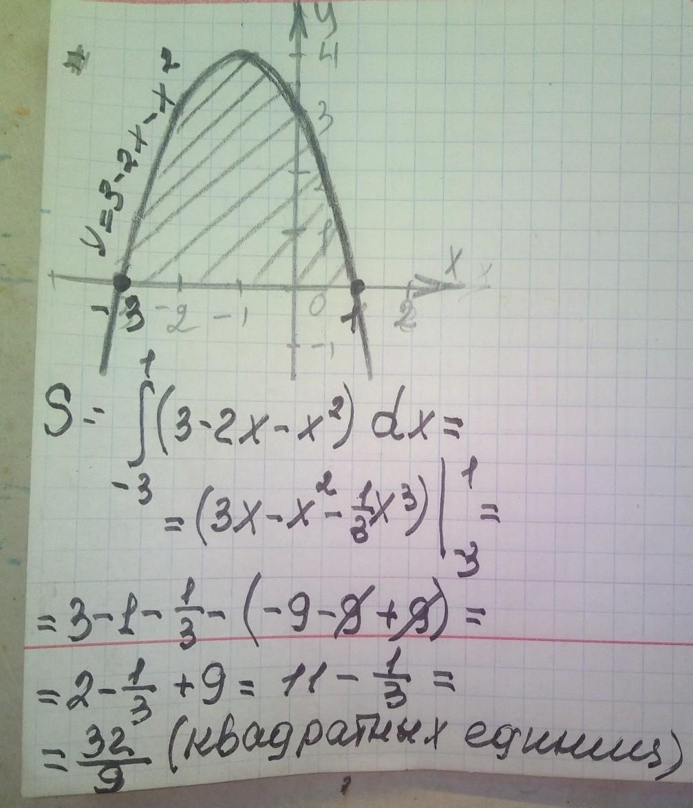 Знайдіть (попередньо виконавши рисунок) площу фігури, обмеженої графіком функції у = 3 - 2x - х2 і віссю абсцис.